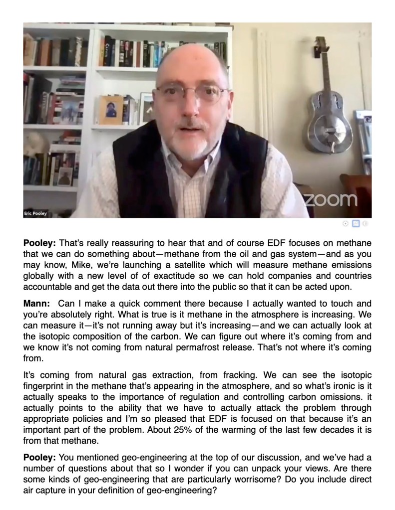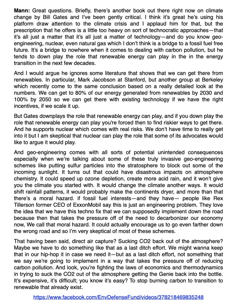 Michael Mann totally dismisses the methane release from subsea thawing permafrost which many scientist fear will become “runaway,” stating that methane concentrations are primarily identified as being associate with natural gas extraction, and that methane concentrations increase and decline naturally. He also strongly endorses carbon fee legislation, blocking fossil fuel expansion and subsidies to the industry along with other efficiencies to decarbonize society—fundamental to his world view is that reducing emissions will quickly stabilize atmospheric CO2 concentration with ocean warming inertia being offset by ocean and biosphere continued absorption of CO2, in a few years. He never mentions the urgency to cool and refreeze the Arctic to restore ice cap albedo and and curtail Greenland ice sheet melting, nor AMOC. He makes no differentiation between global and local Arctic geo-engineering … both are lumped together in his mind, apparently.THESE BELIEFS RUN CONTRARY TO SCIENTIST WHO I AM COLLABORATING WITH. These are topics for urgent resolution. (This transcript is Q&A from 46:00 – 54:00) facebook.com/EnvDefenseFund/videos/378218469835248