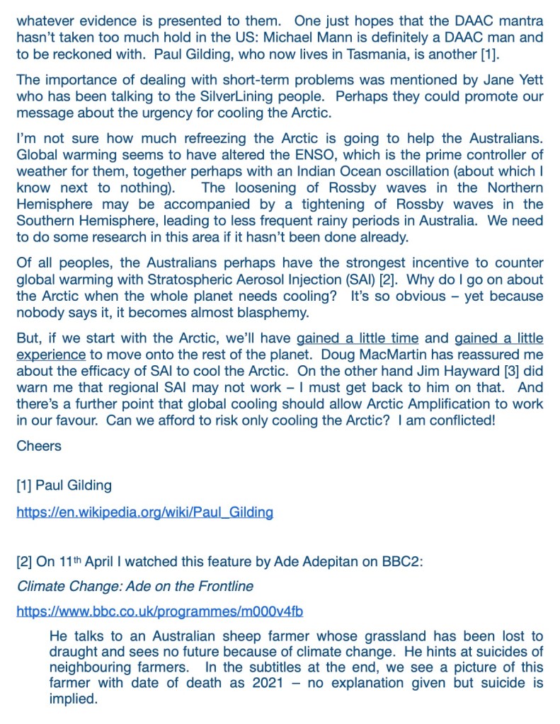 This is the 55th in a series of actual scientists’ emails. Actual scientists deliberate and reprimand those who go off course.Deliberation continues with one key scientist deliberating whether Solar Radiation Management through Stratospheric Aerosol Injection should be limited to the Arctic north of 60°N latitude and beneath the stratosphere for just a few spring and summer months, when global widespread cooling is warranted..