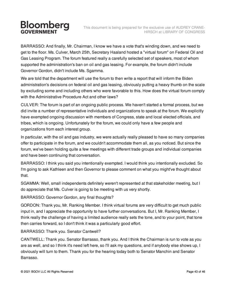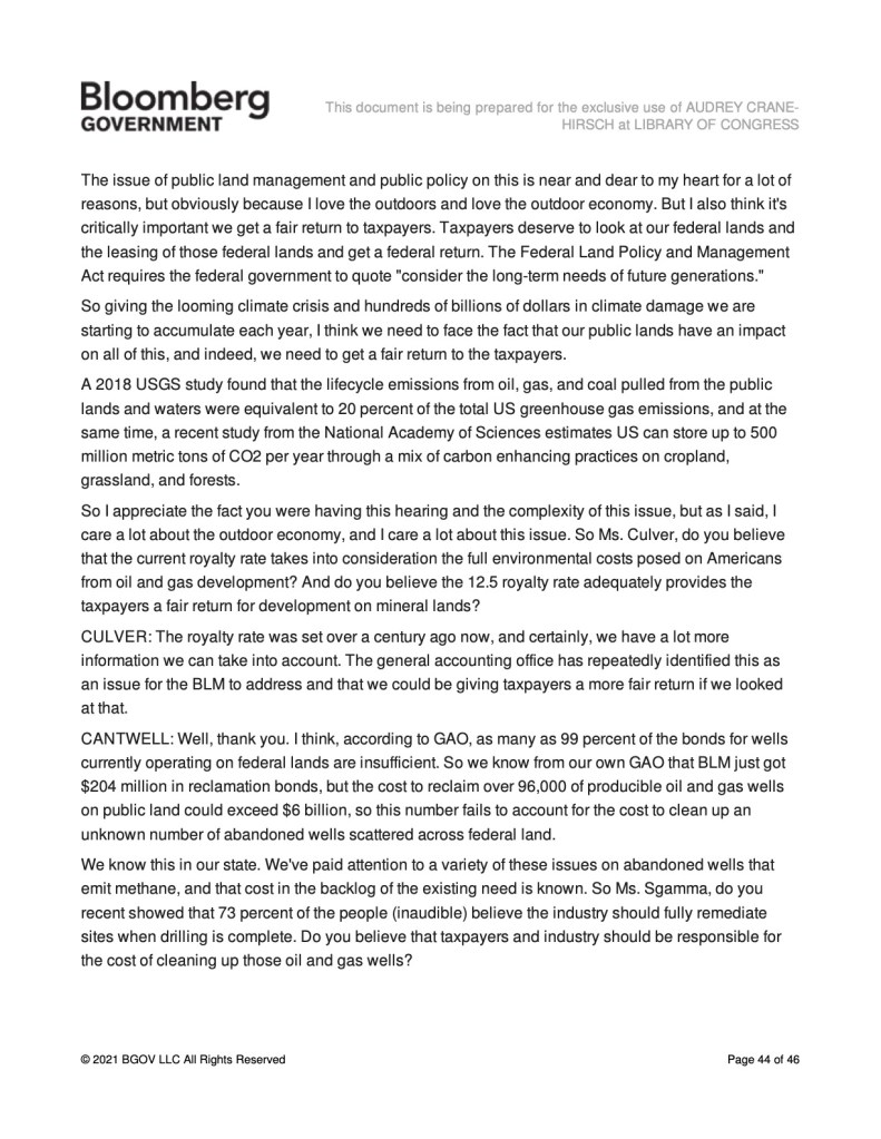 Yesterday, I phoned Senator Maria Cantwell’s DC and Seattle offices and left voice messages requesting a transcript of her comments, questions to the witnesses and their responses. Voila! AFTER SIX YEARS OF LETTERS AND EMAILS TO THE Senate Energy and Natural Resources Committee members, I FEEL LIKE I HAVE FINALLY BEEN HEARD ON THE SUBJECT SHE RAISED ON PAGES 44-45. WATCH STARTING AT 2:06:00 🙂 Archived Hearing Video at https://www.energy.senate.gov/hearings/2021/4/full-committee-hearing-on-the-department-of-the-interior-s-onshore-oil-and-gas-leasing-program.